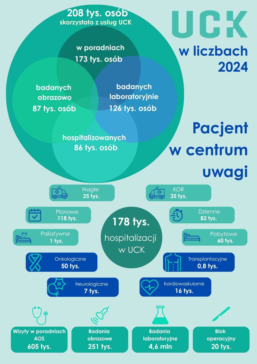 W ofercie Uniwersyteckiego Centrum Klinicznego znajduje się pełen zakres usług medycznych: zaawansowaną diagnostykę, różnorodne zabiegi chirurgiczne, rehabilitacja, a także opieka paliatywna. Posiadamy większość specjalności, jakie dostępne są w obszarze świadczeń usług medycznych, dlatego też naszym pacjentom – także z wieloma chorobami współistniejącymi – zapewniamy kompleksowe leczenie, które realizujemy w oparciu o umowę z Narodowym Funduszem Zdrowia. Oprócz działalności typowo leczniczej, prowadzimy programy edukacyjne, kładąc nacisk na profilaktykę zachorowań.