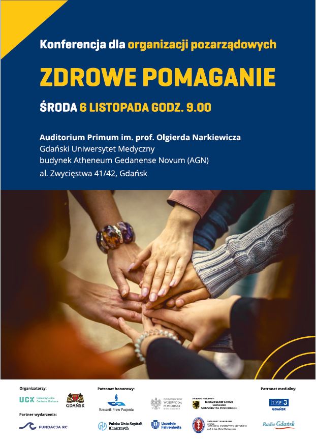 Zapraszamy do udziału w konferencji poświęconej roli organizacji pozarządowych w systemie ochrony zdrowia, która odbędzie się 6 listopada 2024 r. Porozmawiamy o tym, jak pomagać zarówno pacjentom, jak i opiekującym się nimi instytucjom. Organizatorami wydarzenia są miasto Gdańsk i Uniwersyteckie Centrum Kliniczne.