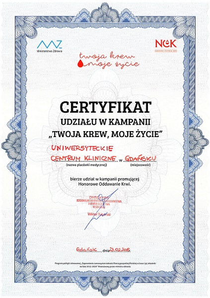 Certyfikat, który otrzymało Uniwersyteckie Centrum Kliniczne, przyznawany jest za udział w kampanii "Twoja krew, moje życie" promującej honorowe oddawanie krwi. Na terenie naszego szpitala można znaleźć ulotki i inne związane z akcją materiały.