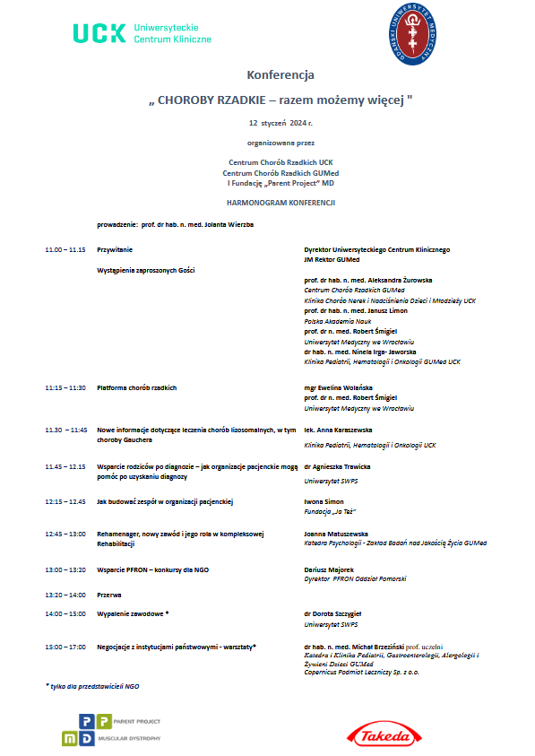 Konferencja „ CHOROBY RZADKIE – razem możemy więcej ", która odbędzie się 12 stycznia 2024 r., organizowana jest przez Centrum Chorób Rzadkich UCK, Centrum Chorób Rzadkich GUMed oraz Fundację „Parent Project” MD.