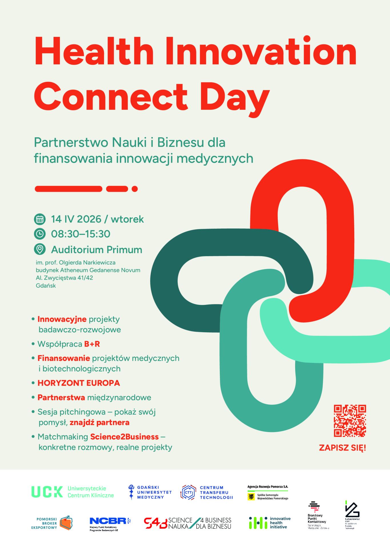 Konferencja naukowo-szkoleniowa Health Innovation Connect Day odbędzie się 14 kwietnia 2026 r. w Auditorium Primum im. prof. Olgierda Narkiewicza w Gdańskim Uniwersytecie Medycznym przy al. Zwycięstwa 41/42 w Gdańsku.