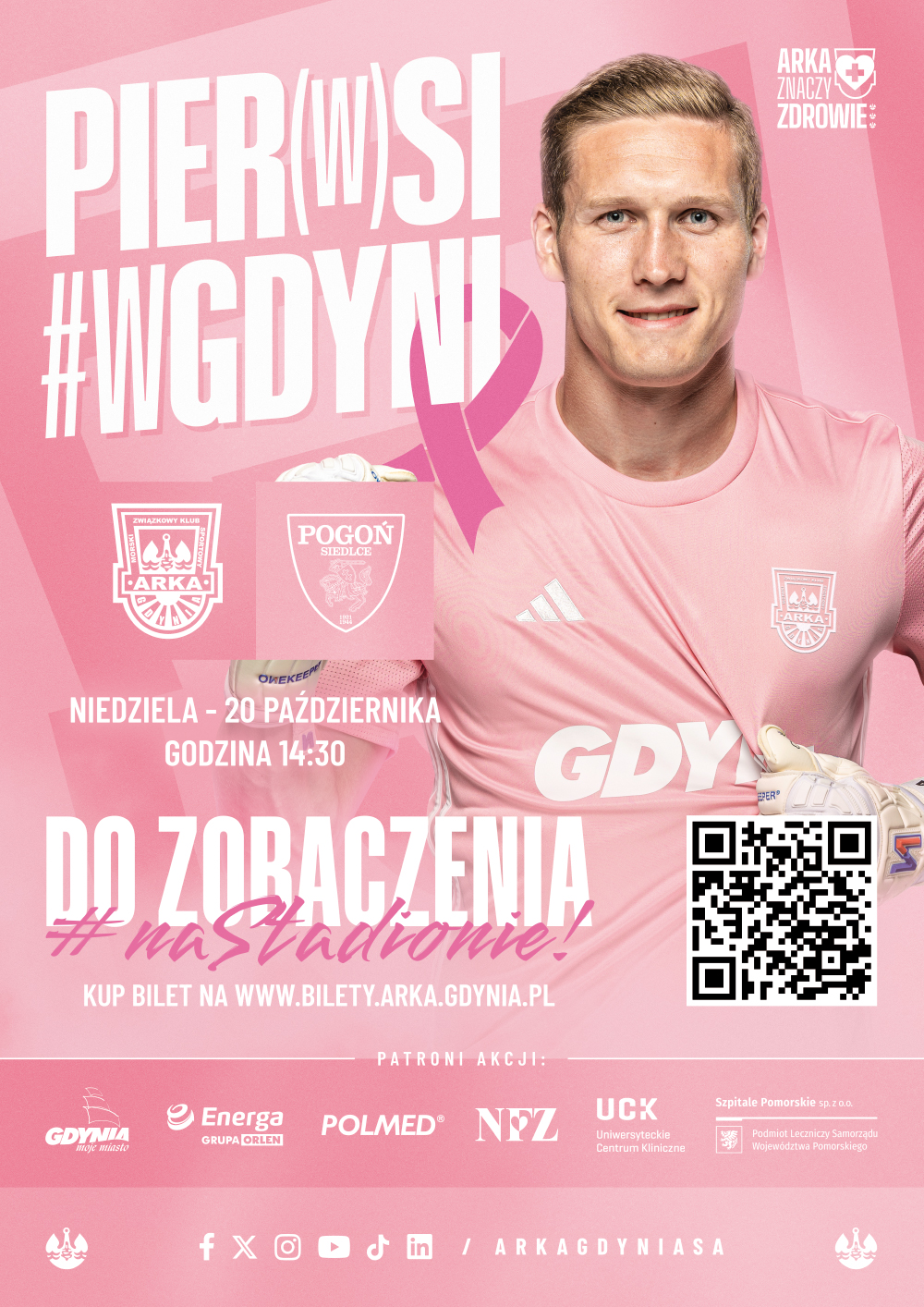 Październik jest miesiącem walki z nowotworem piersi. To właśnie wtedy odbywa się wiele wydarzeń promujących profilaktykę, a jednym z nich jest projekt "Pier(w)si w Gdyni" - mecz Arki Gdynia z Pogonią Siedlce, który gdyńscy piłkarze rozegrają w różowych koszulkach. Wydarzenie odbędzie się na Stadionie Miejskim w Gdyni 20 października 2024 w godzinach od 12:00 do 17:00.