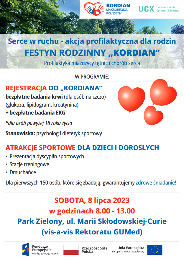 Nasz piknik organizujemy w ramach programu „Kordian”. Ma on na celu przede wszystkim edukować Państwa z zakresu chorób sercowo-naczyniowych oraz uświadamiać, jakie korzyści niesie ze sobą aktywność fizyczna i zdrowe nawyki żywieniowe. W trakcie imprezy będzie możliwość zrobienia sobie bezpłatnych badań krwi (koniecznie trzeba być na czczo) oraz bezpłatnych badań EKG. I teraz uwaga! Dla pierwszych 150 osób, które się zbadają, przygotowaliśmy pyszne, ZDROWE ŚNIADANIE! Specjalnie dla Państwa umożliwimy konsultację z psychologiem oraz dietetykiem sportowym, aby wiedzieć, jakie zmiany w życiu należy wprowadzić!