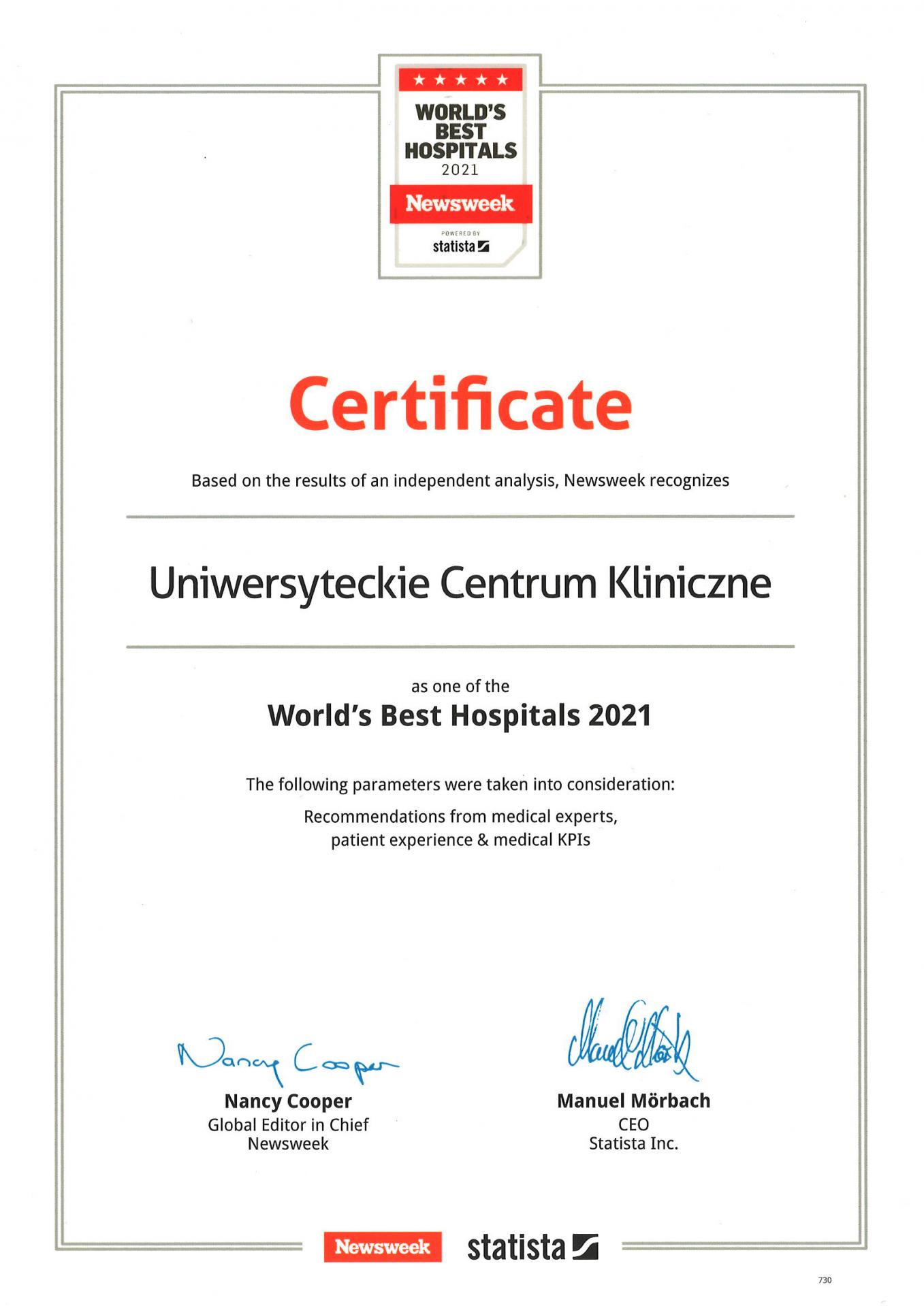 Uniwersyteckie Centrum Kliniczne, zdobywając ogólną ocenę na poziomie 88,42 proc., zajęło drugie miejsce w trzeciej edycji rankingu World’s Best Hospitals 2021, przygotowanego przez magazyn Newsweek oraz firmę Statista, która zajmuje się badaniami rynkowymi i konsumenckimi.