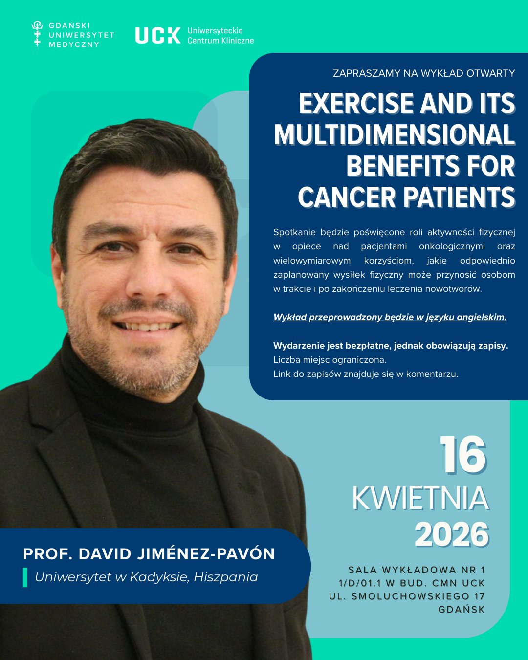 16 kwietnia 2026 r. odbędzie się wykład prof. Davida Jiméneza-Pavóna zatytułowany „Exercise and its Multidimensional Benefits for Cancer Patients”, poświęcony roli aktywności fizycznej w opiece nad pacjentami onkologicznymi.
