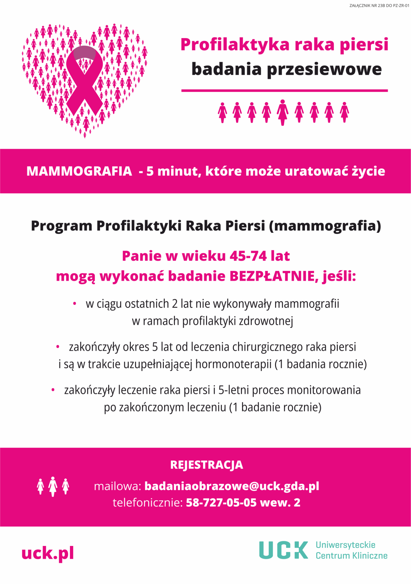 - nie miały wykonywanej mammografii w ciągu ostatnich dwóch lat (przy określaniu wieku należy wziąć pod uwagę rok urodzenia)
