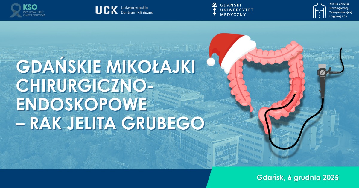 Zapraszamy na wydarzenie Gdańskie Mikołajki Chirurgiczno-Endoskopowe – Rak Jelita Grubego, które odbędzie się 6 grudnia 2025 r. (sobota) w godz. 9:00-15:00 w auli im. prof. Z. Kieturakisa, budynek Centrum Medycyny Inwazyjnej.