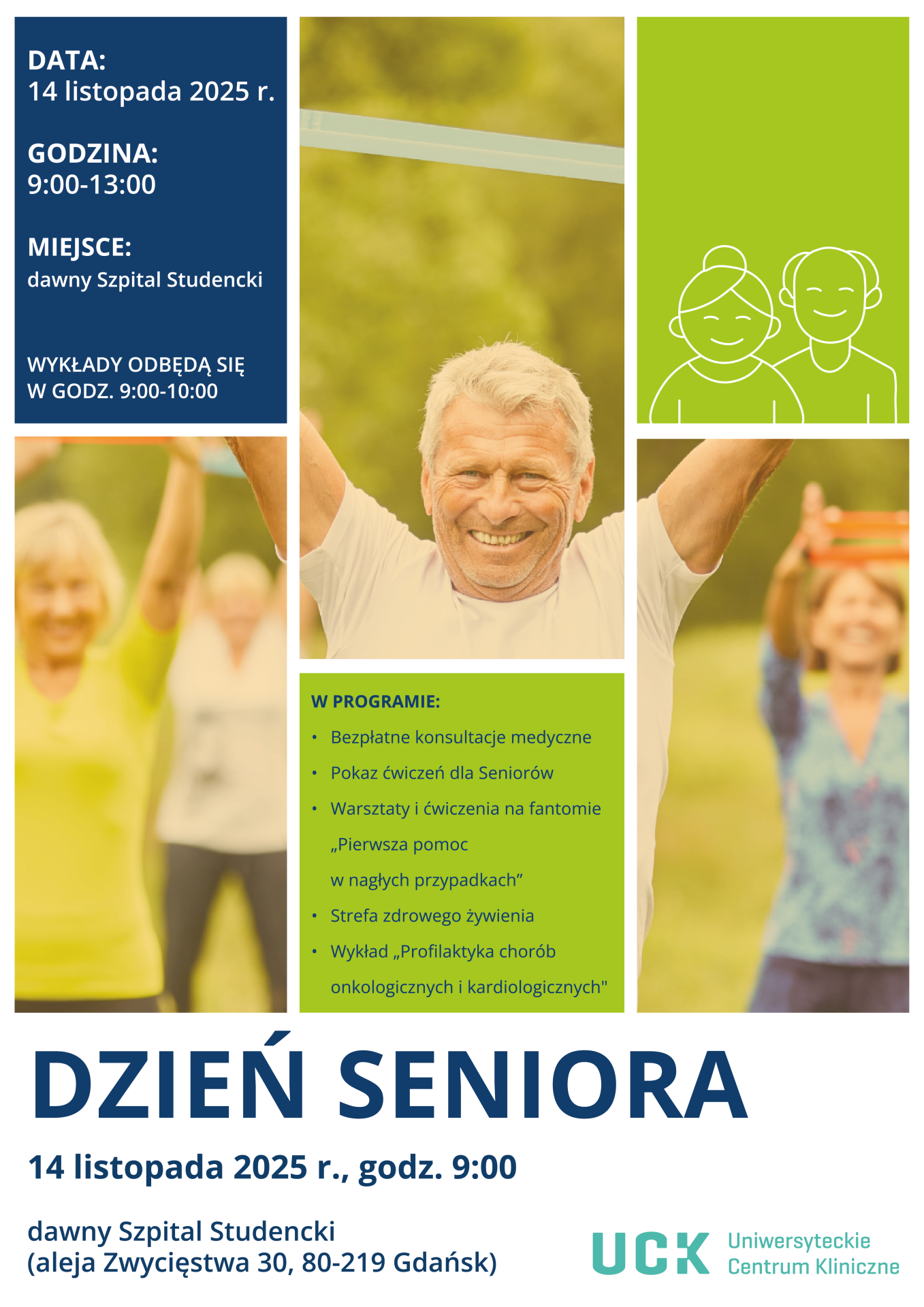 Z okazji Światowego Dnia Seniora zapraszamy do UCK na bezpłatne konsultacje medyczne, warsztaty z pierwszej pomocy, wykłady oraz inne atrakcje. Wydarzenie odbędzie się 14 listopada br. w godz. 9:00-13:00 w dawnym Szpitalu Studenckim (aleja Zwycięstwa 30, 80-219 Gdańsk).