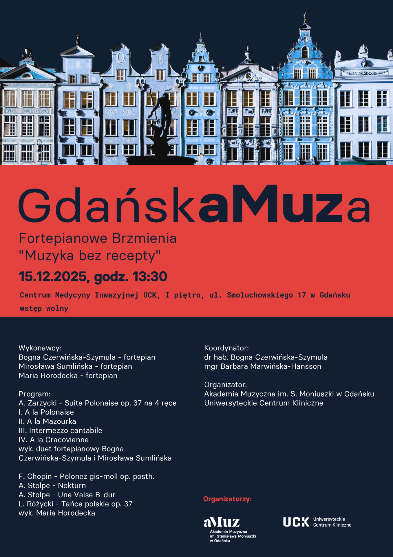 Kolejny koncertu z cyklu "GdańskA MUZa. Muzyka bez recepty" będzie wyjątkowy. Tym razem swoje siły połączą prof. Bogna Czerwińska-Szymula i dr Mirosława Sumlińska, wykładowczynie Akademii Muzycznej w Gdańsku, które wystąpią w duecie fortepianowym, oraz Maria Hordecka studentka, która zagra solo także na fortepianie. Usłyszymy m.in. kompozycje Chopina, Zarzyckiego i Różyckiego.