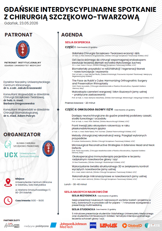 Gdańskie Interdyscyplinarne Spotkanie z Chirurgią Szczękowo-Twarzową to wydarzenie naukowe poświęcone współczesnym wyzwaniom diagnostycznym i terapeutycznym w obrębie twarzoczaszki, podkreślające znaczenie interdyscyplinarnej współpracy w leczeniu pacjentów.