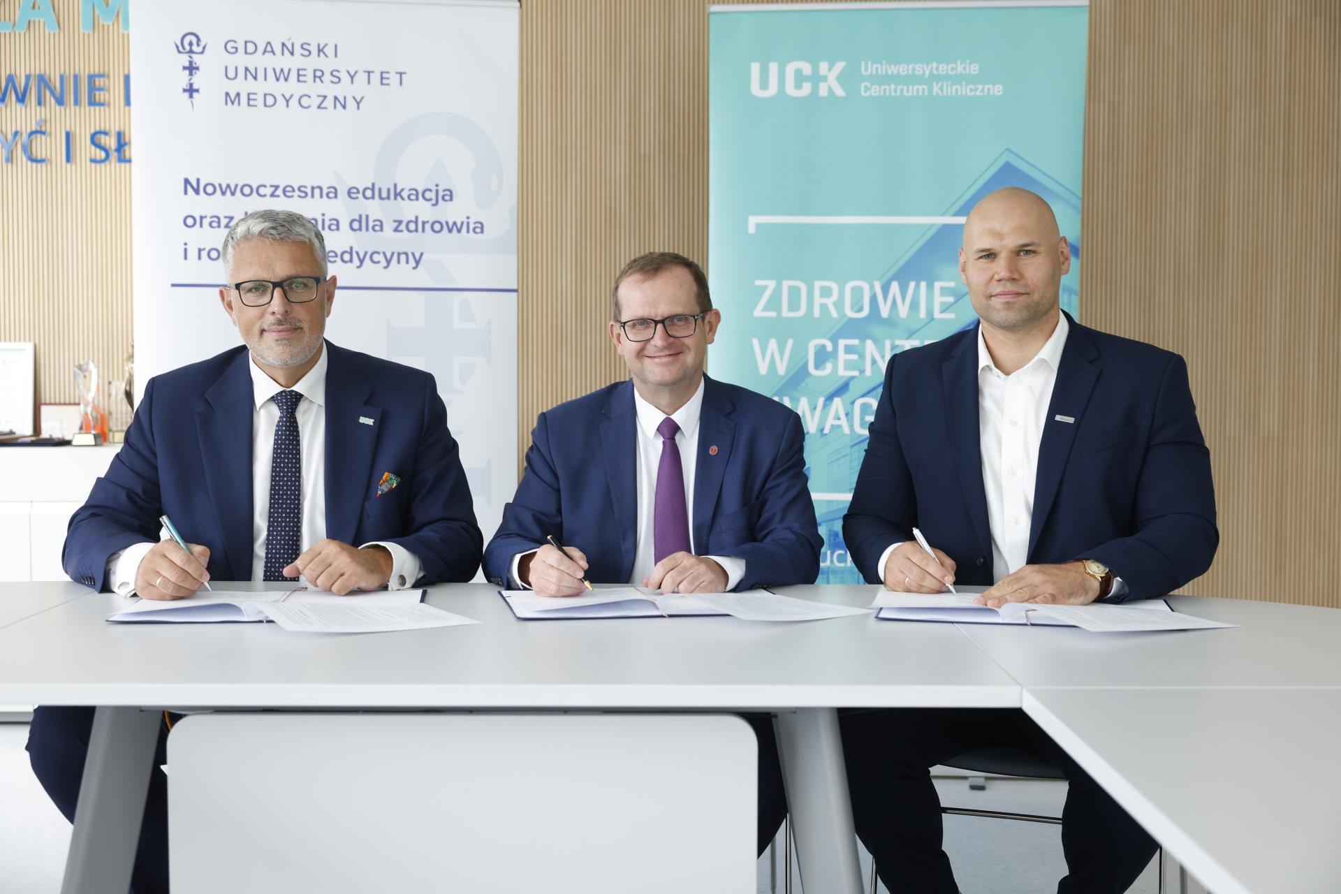 15 września podpisali dr Jakub Kraszewski, dyrektor naczelny Uniwersyteckiego Centrum Klinicznego, szpitala GUMed, prof. Michał Markuszewski, rektor Gdańskiego Uniwersytetu Medycznego oraz Arkadiusz Grądkowski, prezes Izby POLMED. Umowa otwiera drogę do realizacji wspólnego projektu Ścieżka Innowacyjnego Medyka.