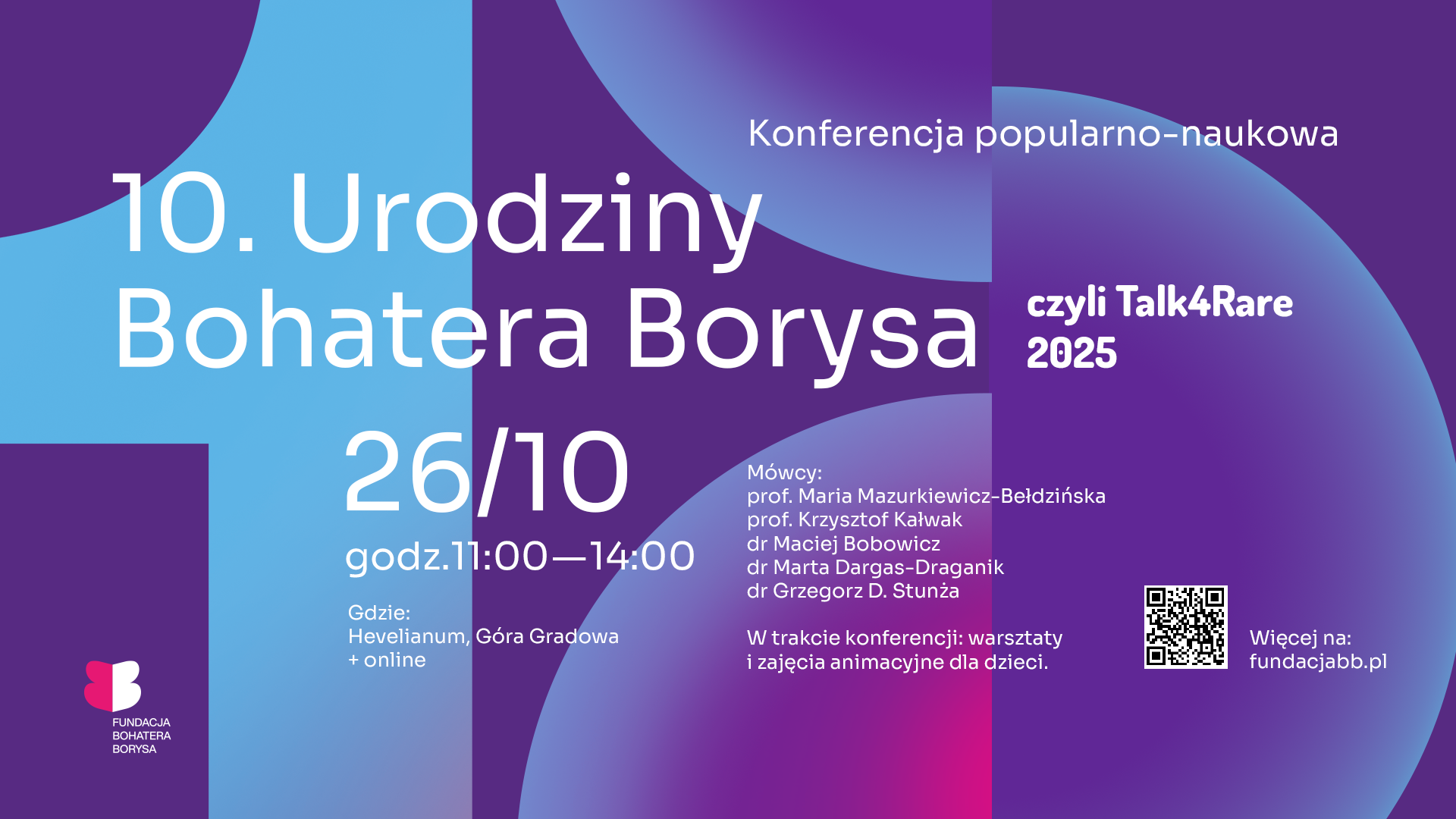 26 października 2025 r. o godz. 11:00 w Hevelianum w Gdańsku odbędzie się konferencja „Urodziny Bohatera Borysa | Talk4Rare”. To cykliczne wydarzenie służy budowaniu wiedzy i świadomości społecznej o chorobach rzadkich – ich diagnozowaniu, terapiach oraz codziennych wyzwaniach rodzin, których dotyczą.